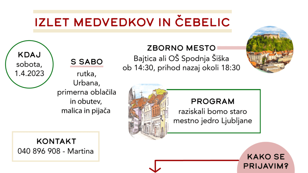 Ostalo Izlet medvedkov in čebelic od admin|Objavljeno 2. 3. 2023-Updated 30. 1. 2024Prijave zbiramo do 17. 3. preko obrazca.