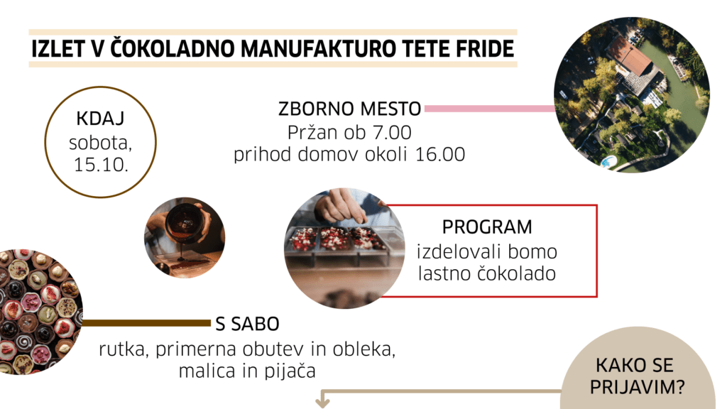 Ostalo Izlet v čokoladnico od admin|Objavljeno 26. 9. 2022-Updated 12. 10. 2022Prijave zbiramo do 5.10. preko obrazca.